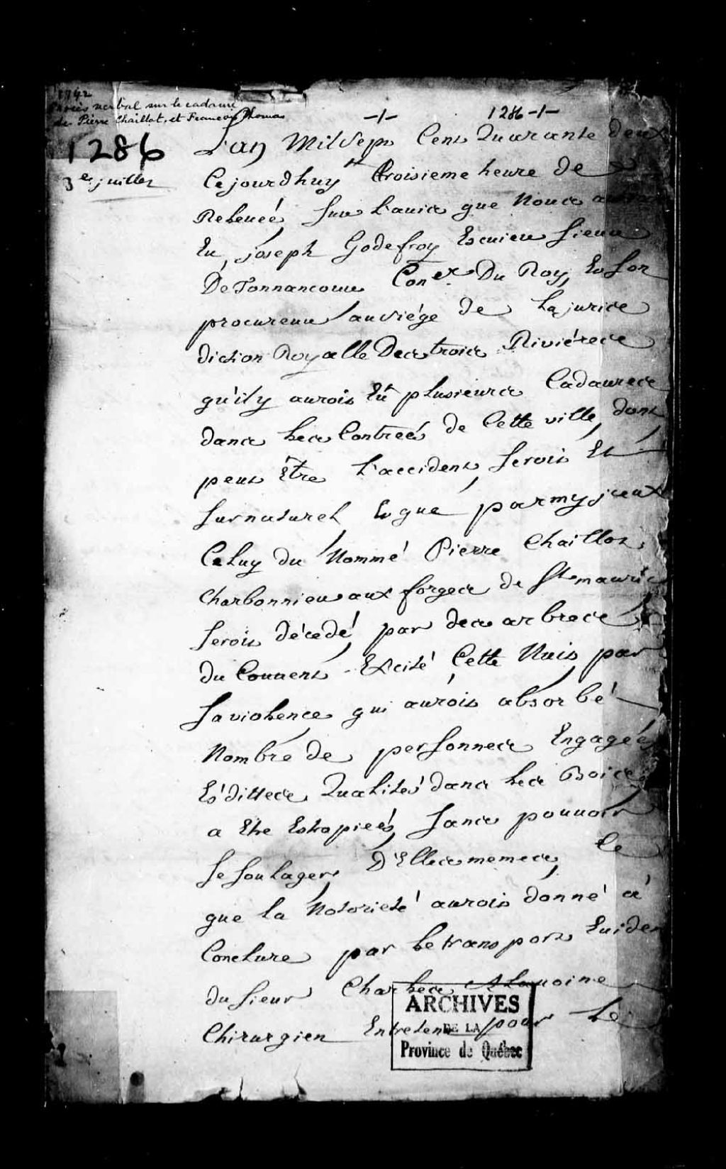Procès-verbal de Joseph Godefroy, sieur de Tonnancour, procureur du Roi à la Juridiction royale des Trois-Rivières, sur la visite des cadavres de Pierre Chaillot et de François-Thomas Chaillot, charbonniers, tués aux Forges de Saint-Maurice, par les branches d'un arbre (accident surnaturel), 3 juillet 1742, Archives nationales à Québec, Collection Pièces judiciaires et notariales, (03Q,TL5,D1286).