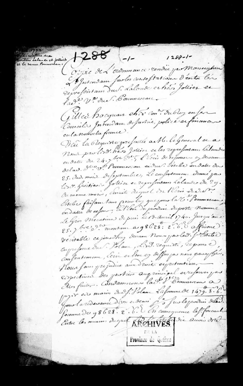 Copie d'une ordonnance rendue par l'intendant Gilles Hocquart, dans la cause opposant les héritiers Lalande et Jolliet à la veuve Pommereau, 4 octobre 1742, Archives nationales à Québec, Collection Pièces judiciaires et notariales, (03Q,TL5,D1288).