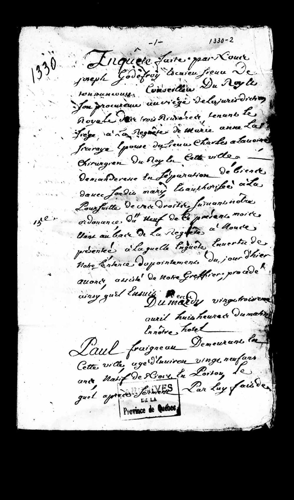 - Ce dossier en matières civiles provient de la Juridiction royale des Trois-Rivières et contient les témoignages ou les dépositions des personnes suivantes : Paul Fraigneau, demeurant à Trois-Rivières, âgé de 29 ans, natif de Niort en Poitou; Louis Coursol dit Laflotte (Coursolle dit La Floste), demeurant à Trois-Rivières, âgé de 42 ans; Jean Trullier (Truiller) Lacombe, demeurant à Trois-Rivières, âgé de 61 ans. Ce dossier comprend une ordonnance de la Juridiction royale des Trois-Rivières et une enquête