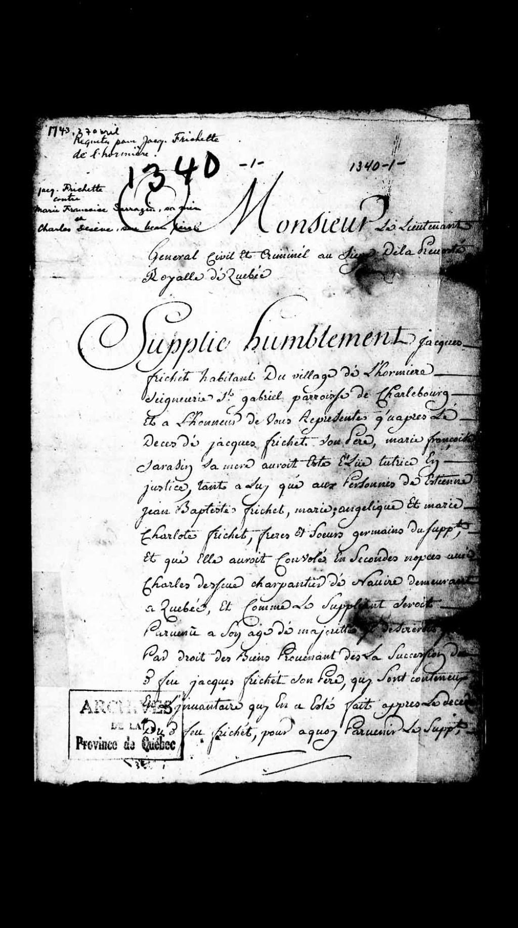 - Procès opposant Jacques Frichet (Frichette), habitant du village de L'Ormière, seigneurie de Saint-Gabriel, paroisse de Charlesbourg, à Marie-Françoise Sarrazin, sa mère, et Charles Desève, son beau-père, charpentier de navire, demeurant à Québec, tuteur des mineurs Frichet, concernant le compte rendu de la gestion des biens dépendants de la succession de son père Jacques Frichet père