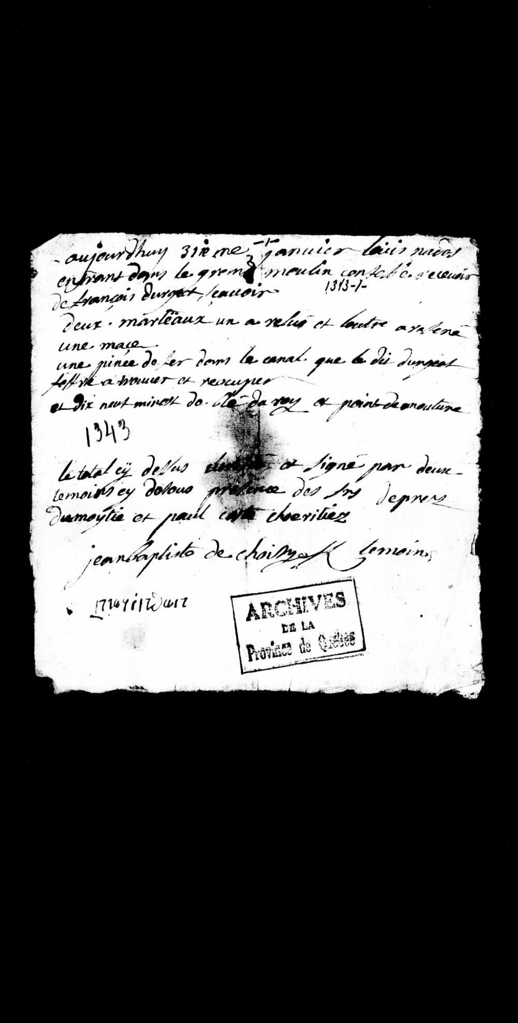 Procès de François Drugeot, de la Pointe-à-la-Caille, paroisse de Saint-Thomas sur la Côte-du-Sud, meunier engagé pour faire tourner le grand moulin de la Rivière-du-Sud, contre les sieurs Louis Couillard, seigneur primitif de la seigneurie de la Rivière-du-Sud, Paul Couillard, Louis Côté, comme ayant épousé Élisabeth Couillard et Alexis Dion Dumontier, veuf de Marie-Simone Couillard, cohéritiers et tous propriétaires du fief de la Rivière-du-Sud, pour dommages et intérêts; certains des cohéritiers, Dumontier et Côté, l'auraient traité avec violence et lui auraient enlevé le contrôle du moulin, ne respectant pas leur part du contrat d'engagement du 27 décembre 1741, 27 décembre 1741 au 31 août 1743, Archives nationales à Québec, Collection Pièces judiciaires et notariales, (03Q,TL5,D1343).