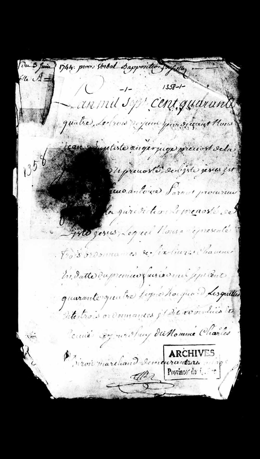 - Ce dossier en matières criminelles provient de la Juridiction royale de Montréal et du Conseil supérieur de Québec et contient les témoignages ou les dépositions des personnes suivantes : Jean Lacoste, âgé de 23 ans, chirurgien de profession, natif de Bayonne en France, demeurant actuellement chez le nommé Joachim Labelle (Label), habitant de l'île Jésus; Charles Biron, négociant à Terrebonne, âgé de 47 ans; Bertrand Guérin, cabaretier demeurant en la paroisse de l'île Jésus, âgé de 43 ans; Joachim Labelle, habitant de la paroisse de l'île Jésus, âgé de 52 ans; Charles Hery (Héry), négociant demeurant à Montréal, rue Saint-Paul, expert nommé d'office par la Juridiction pour la vérification d'écritures, âgé de 33 ans; maître François Simonnet, notaire royal de Montréal, demeurant rue Saint-Paul, expert nommé d'office par la Juridiction pour la vérification des écritures. Ce dossier comprend le procès-verbal d'apposition des scellés sur [...]