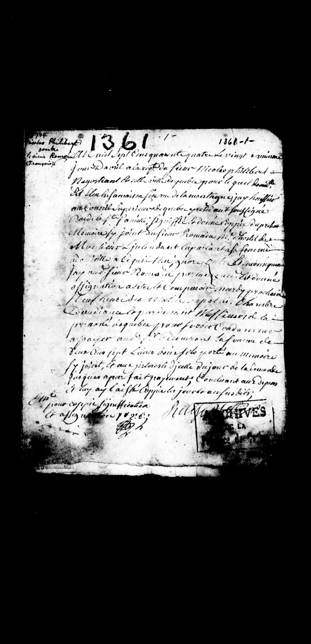 - Procès de Nicolas Philibert, négociant de Québec, contre François Romain, maître d'hôtel de l'intendant, à propos d'une somme de 207 livres qu'il lui réclame pour diverses marchandises