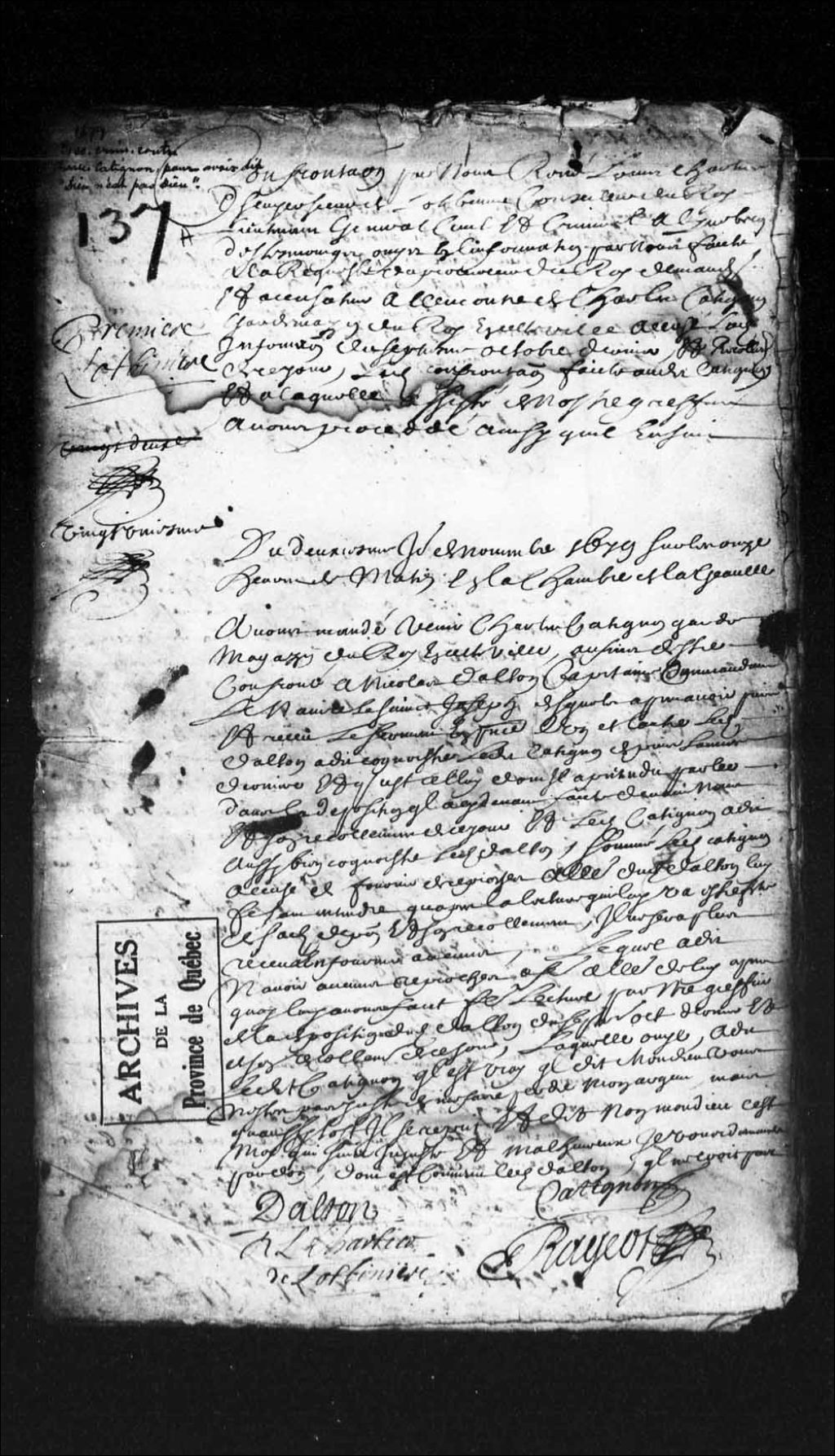 Procédures criminelles contre Charles Catignon, garde-magasin du roi à Québec, pour blasphème et avoir dit «Dieu n'est pas Dieu», 2 novembre 1679 - 3 novembre 1679, Archives nationales à Québec, Collection Pièces judiciaires et notariales, (03Q,TL5,D137).
