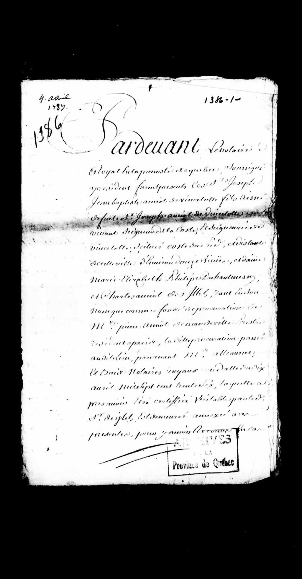 - Ce dossier en matières civiles provient de la Prévôté de Québec et du Conseil supérieur de Québec. Il comprend une cession des parts des héritiers de la seigneurie de Vincelot, à l'aîné, Joseph-Jean-Baptiste Amiot (collation d'un acte d'un notaire royal de la Prévôté de Québec, du 4 avril 1737, par Boisseau, greffier en chef de la Prévôté, le 22 avril 1744); un état des dépenses d'un moulin; des exploits de signification et d'assignation; les réponses succinctes de Roy; les défenses des héritiers Amiot; la comparution au greffe de la Prévôté du huissier Clesse; les ordonnances rendues dans ce procès par la Prévôté de Québec; des requêtes présentées par Jean Roy à la Prévôté de Québec et à l'Intendant; un mémoire; un arrêt du Conseil supérieur de Québec; les griefs et moyens d'appel des héritiers VincelotLe titre complet de la pièce se lit comme suit : Procès de Jean Roy, aubergiste à La Rochelle, créancier de la succession de Joseph Amiot, représenté par François Clesse, premier huissier au Conseil supérieur de Québec, contre Joseph-Jean-Baptiste Amiot de Vincelot (Vincelotte), Charles Amiot des Ilets, tant en son nom que comme fondé de procuration de maître Pierre Amiot de Mandeville, prêtre résident à Paris, Ignace Amiot dit de Saint-Ignace, présentement en Amérique et Jean-Gabriel Amiot du Hautmesny, frères et héritiers de feu Joseph Amiot, seigneur de la côte et seigneurie de Vincelote, située en la Côte-du-Sud, et de dame Marie-Elisabeth-Philippe du Hautmesny (Hautmesnil)
