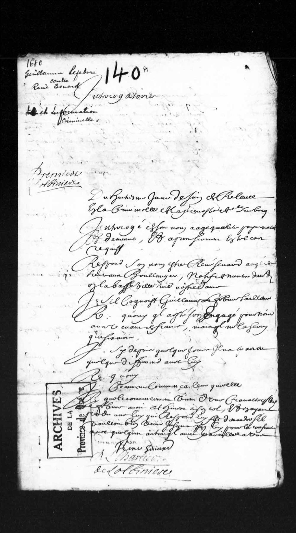 - Ce dossier en matières criminelles provient de la Prévôté de Québec et contient les interrogatoires ou les dépositions des personnes suivantes : René Senard, 30 ans, boulanger, natif de Nantes, demeurant en la Basse-Ville (Québec), rue Notre-Dame; Marie Soumande, veuve de Joseph Mignault, 25 ans, native de Québec, y demeurant chez Pierre Soumande, son père; Guillaume Marion, qui dit avoir bientôt treize ans (le lieutenant général renvoie ce témoin parce que trop jeune pour témoigner); Louis Lebidan, 32 ans, forgeron, natif d Oray, demeurant à Québec, chez le nommé Nautoin, rue Notre-Dame; Pierre Soumande, 64 ans, taillandier, natif de Morval en Gascogne, demeurant à Québec, rue Notre-Dame; Marie Péré, 56 ans, femme de Thierry Delestre Le Vallon, bourgeois de Québec, native d Ortez en Béarn, demeurant à Québec, rue Notre-Dame. Ce dossier comprend l'interrogatoire; l'information; les conclusions du procureur; la requête de Guillaume Lefebvre