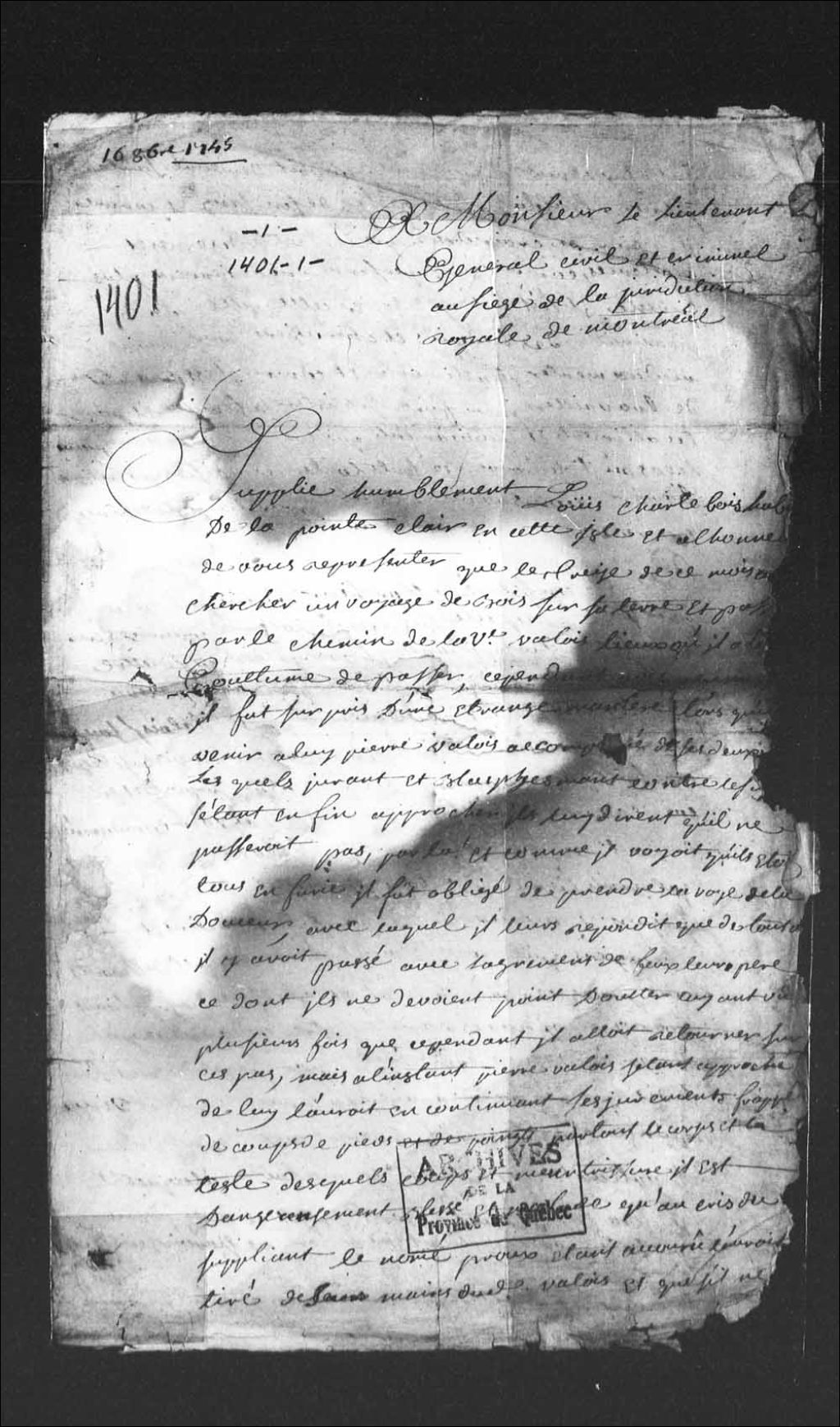 - Procès de Louis Charlebois, habitant de Pointe-Claire, sur l'île de Montréal contre Pierre Valois, pour voies de fait (violence)