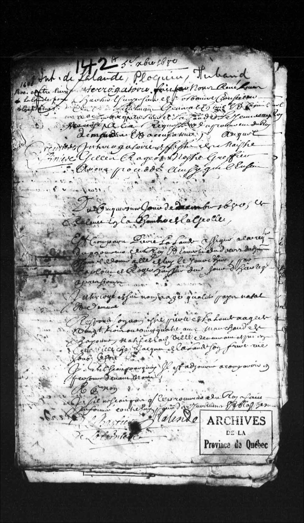 Procédures criminelles contre Pierre de Lalande, jeune, frère de Jacques de Lalande de Gayon, pour blasphème, 6 novembre 1680 - 5 décembre 1680, Archives nationales à Québec, Collection Pièces judiciaires et notariales, (03Q,TL5,D142).