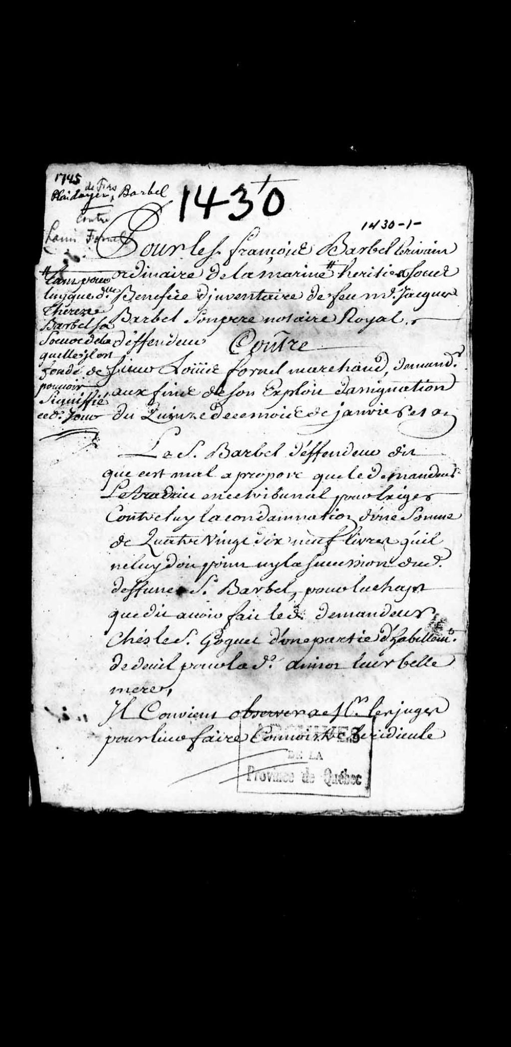 - Procès de Louis Fornel, marchand, demandeur, contre François Barbel, écrivain ordinaire de la Marine, faisant tant pour lui que pour sa soeur Thérèse Barbel, défendeur, à propos d'une somme d'argent ayant servi à l'achat d'un habit de deuil à la suite du décès du sieur Barbel