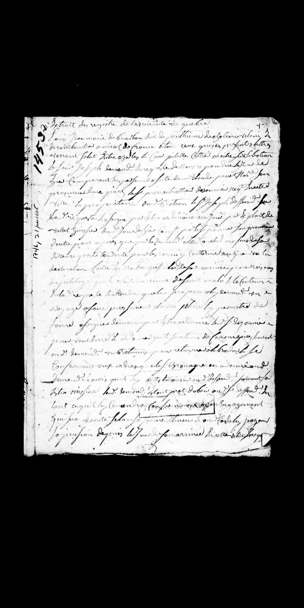 - Ce dossier en matières civiles provient de l'Amirauté de Québec et du Conseil de Québec. Il comprend deux extraits des registres de l'Amirauté de Québec, l'un étant les déclarations du défendeur, l'autre condamne le défendeur à payer une certaine somme au demandeur; les défenses fournies par le demandeur; la confirmation de la condamnation; une requête du sieur Brouague, négociant; la déclaration du demandeur; une lettre adressée au Conseil supérieur de Québec qui requiert l'interrogatoire du demandeur; ainsi que les griefs et moyens d'appel que fournit le demandeur