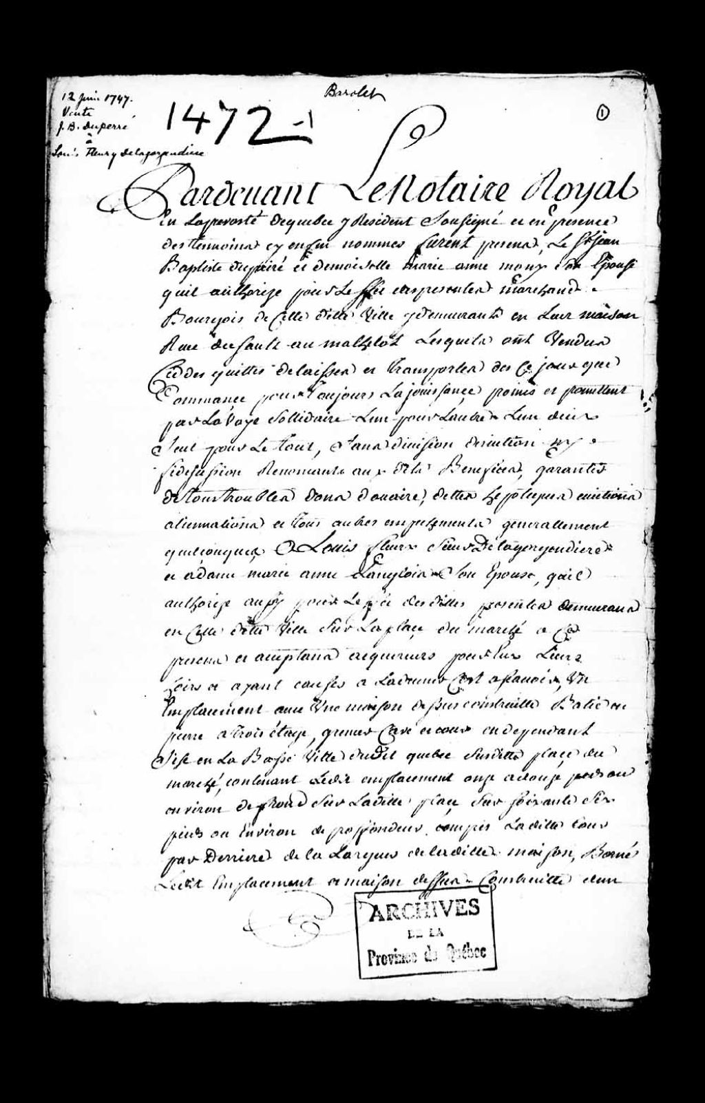 - Vente par Jean-Baptiste Dupéré et Marie-Anne Mony (Mosny), son épouse, à Louis Fleury de la Gorgendière (Lagorgendière) et à Marie-Anne Langlois son épouse, d'un emplacement avec une maison en la Basse-Ville de Québec