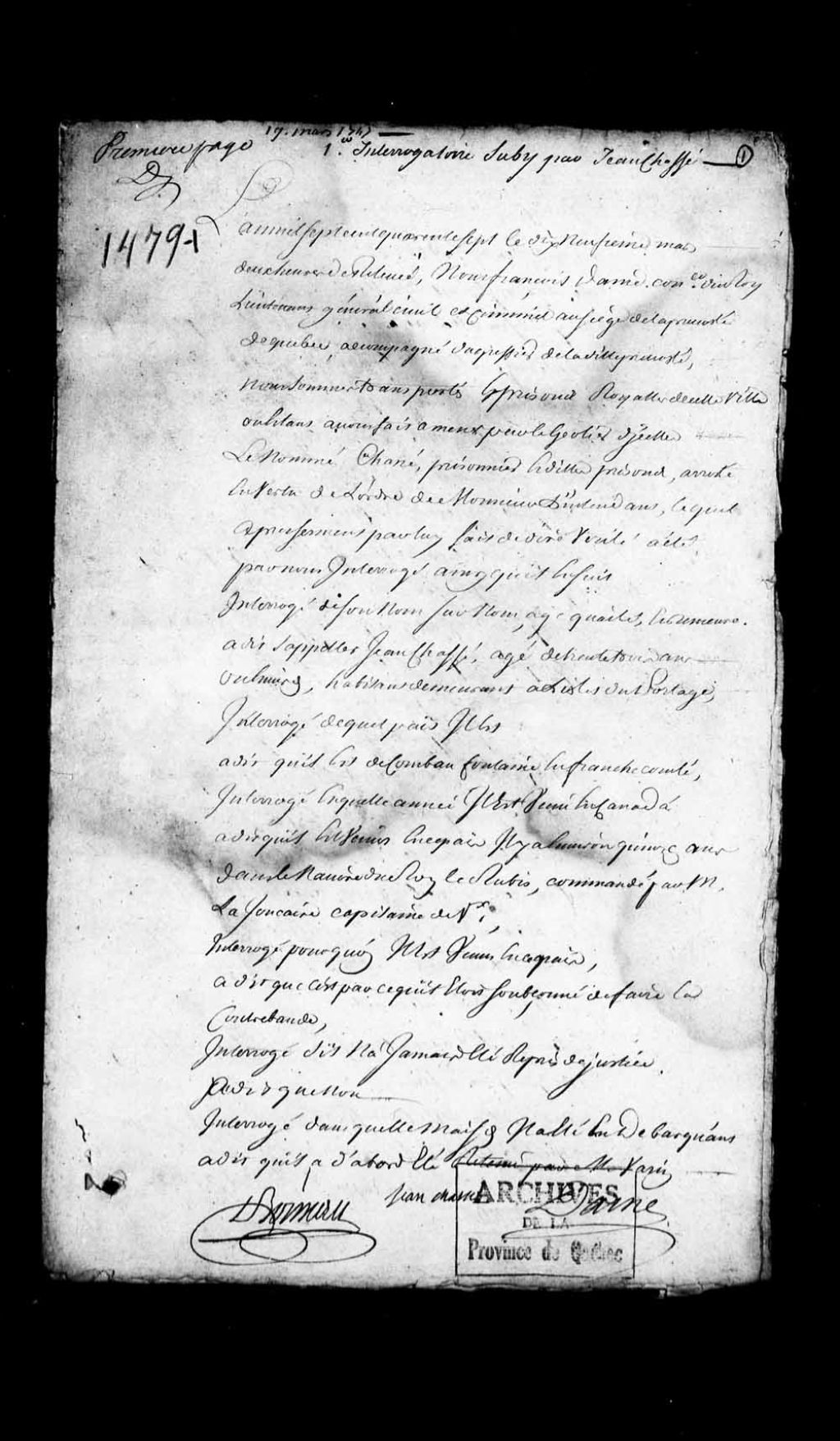 - Ce dossier en matières criminelles provient de la Prévôté de Québec. Il contient les interrogatoires ou les dépositions des personnes suivantes : Jean Chassé, habitant de l'Islet du Portage; Charles Marquis, demeurant à la Rivière des Caps en la paroisse Saint-Louis, 55 ans; Jérome Dupuis, armurier, demeurant en la paroisse Saint-Jean, 42 ans; Jacques Paradis, demeurant en la Paroisse Saint-Louis de Kamouraska, 48 ans; Marguerite Levasseur, femme d'André Ouellet, habitant de la paroisse Saint-Louis en l'île du Portage, 34 ans; François Migneault, demeurant à l'île Saint-Jean chez le sieur Fournier, 18 ans; Charles Berthaudy (Bertode) dit Saint-Michel, demeurant en la paroisse Saint-Pierre à la Rivière-du-Sud, 42 ans; Louis Brulot, demeurant en la paroisse Saint-François en la Rivière-du-Sud, 61 ans. Ce dossier comprend trois interrogatoires de l'accusé; l'assignation des témoins (six documents différents); les assignations du sieur [...]