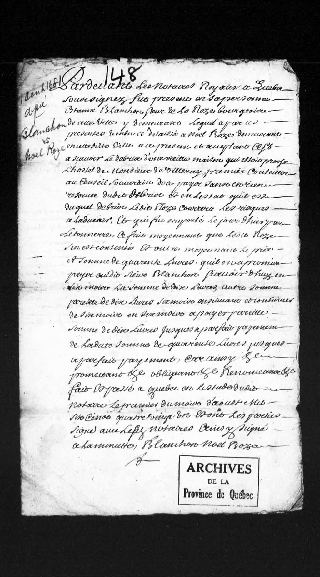 Vente du débris d'une vielle maison (masure) proche de chez monsieur de Villeray premier conseiller au Conseil souverain de ce pays, par Etienne Blanchon sieur de Larose, bourgeois de Québec à Noël Rose, suivi d'un exploit du huissier Etienne Marandeau, fait à la requête de Jean-Baptiste Mourmeliers (Monmellian), au nom de son épouse Marie Juneau Lamy, 1er août 1681 - 31 décembre 1681, Archives nationales à Québec, Collection Pièces judiciaires et notariales, (03Q,TL5,D148).