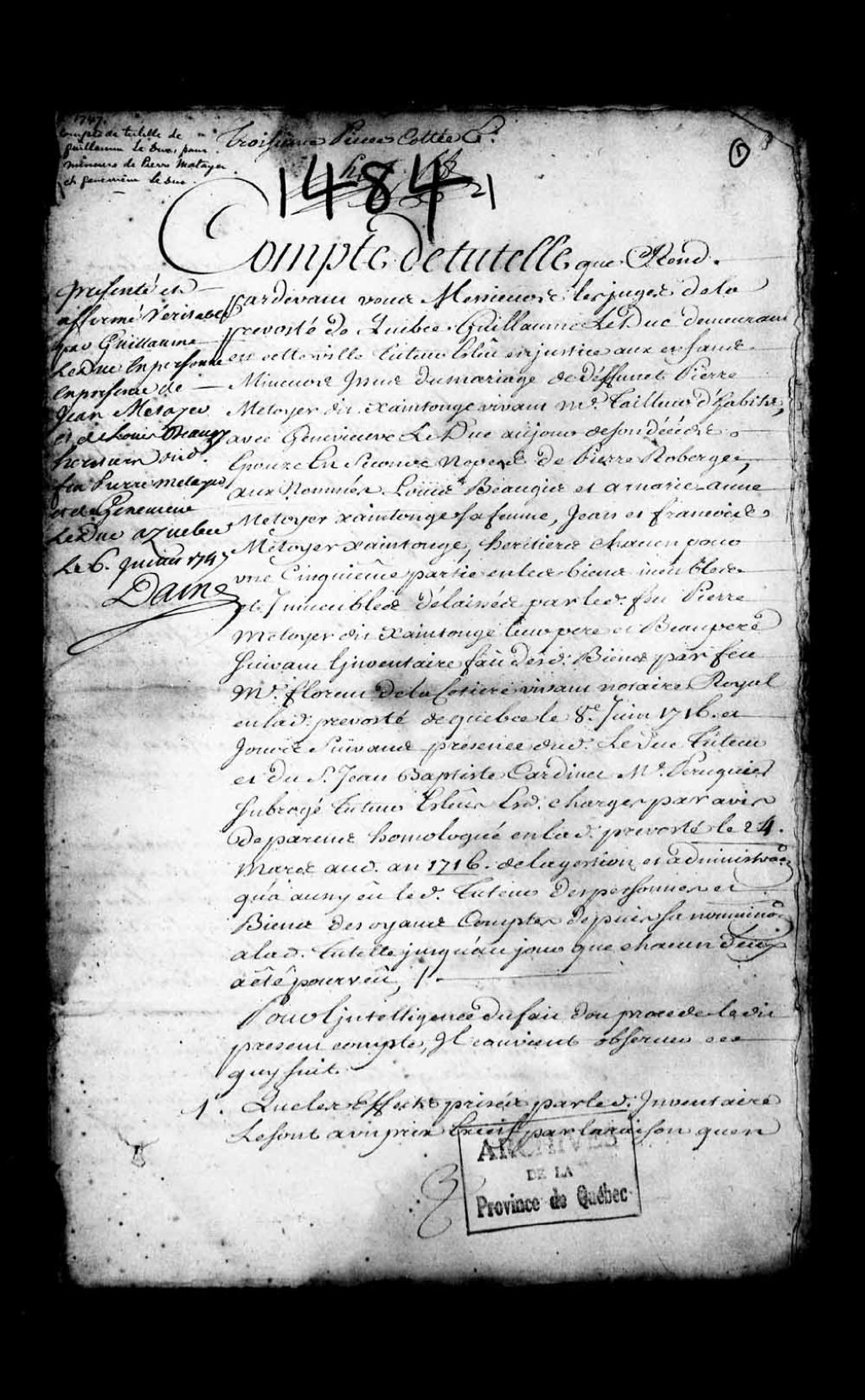 - Compte de tutelle de Guillaume Leduc, pour les mineurs de Pierre Métayer et de Geneviève Leduc