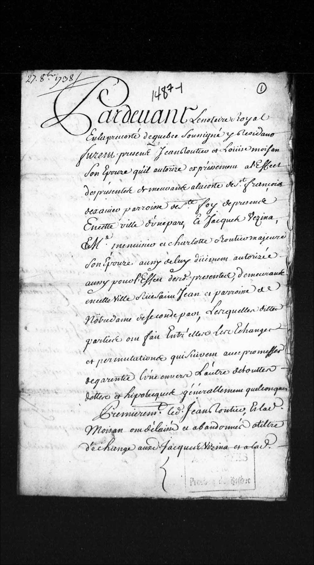 - Ce dossier comprend un échange entre Jean Routhier et Jacques Vézina (notaire Claude Barolet); l'inventaire des biens de la communauté de Jean Routhier et Louise Moisan (notaire Christophe-Hilarion Dulaurent); ainsi qu'une facture a ladite Moisan, veuve du feu sieur Routhier, payable au notaire Dulaurent