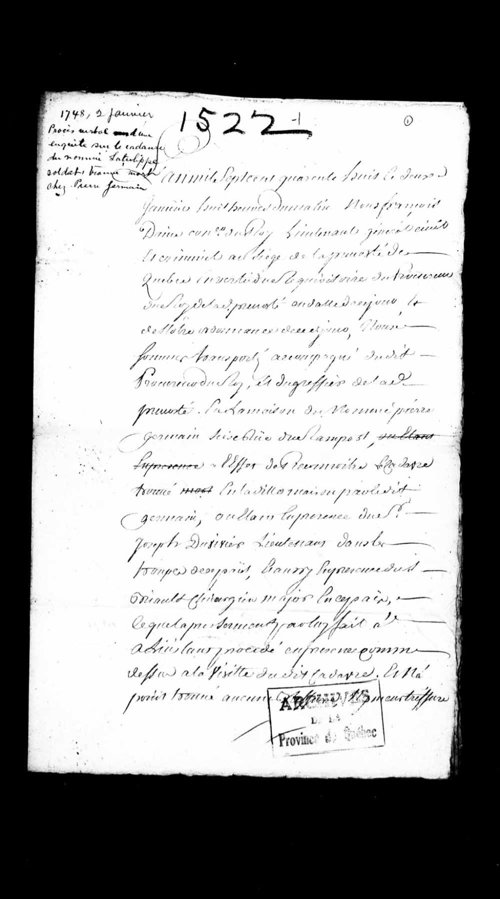 Procès-verbal d'une enquête sur le cadavre du nommé Latulippe, soldat de la compagnie de Pensens, trouvé mort chez Pierre Germain, demeurant rue des Remparts, à Québec, par le sieur Briault, chirurgien major en Nouvelle-France (mort naturelle)