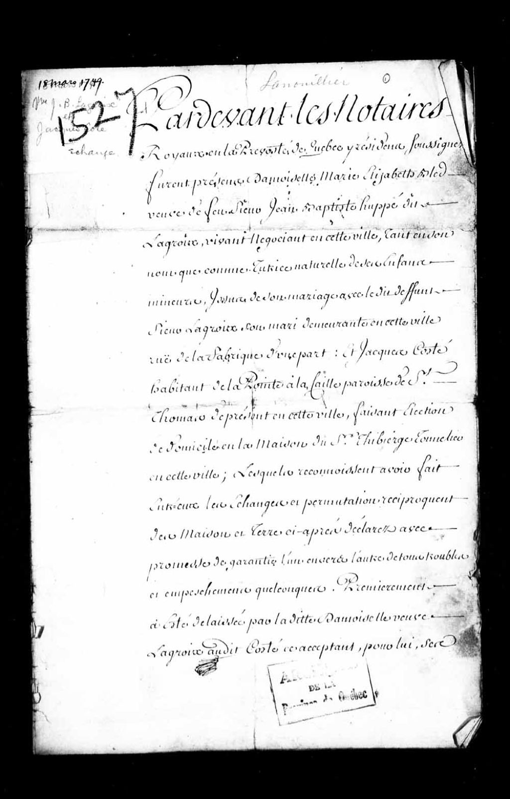 Échange entre Marie-Élisabeth Bled, veuve de feu sieur Jean-Baptiste Huppé dit Lagroix, de son vivant négociant de Québec, et Jacques Côté, habitant de la Pointe à la Caille paroisse de Saint-Thomas