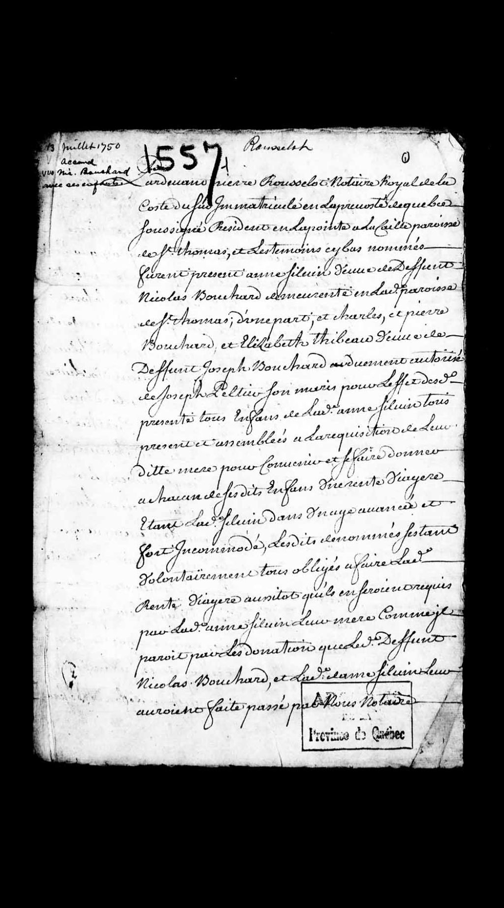 Accord entre Anne Silvain (Sylvain), veuve de feu Nicolas Bouchard, demeurant en la paroisse de Saint-Thomas et ses enfants