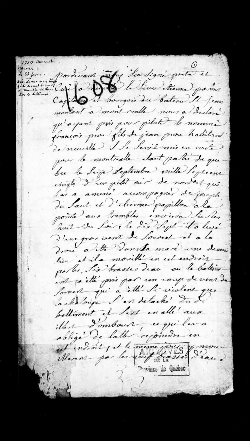 - Requête adressée au lieutenant général civil et criminel au siège de l'Amirauté de Québec par Étienne Parant (Parent), maître et propriétaire du bateau «le Saint-Jean», déclarant le mauvais temps et les avaries subis par le navire, François Prou, pilote dudit navire, fils de Jean Prou (Proulx), habitant de Neuville et Augustin Savay, matelot