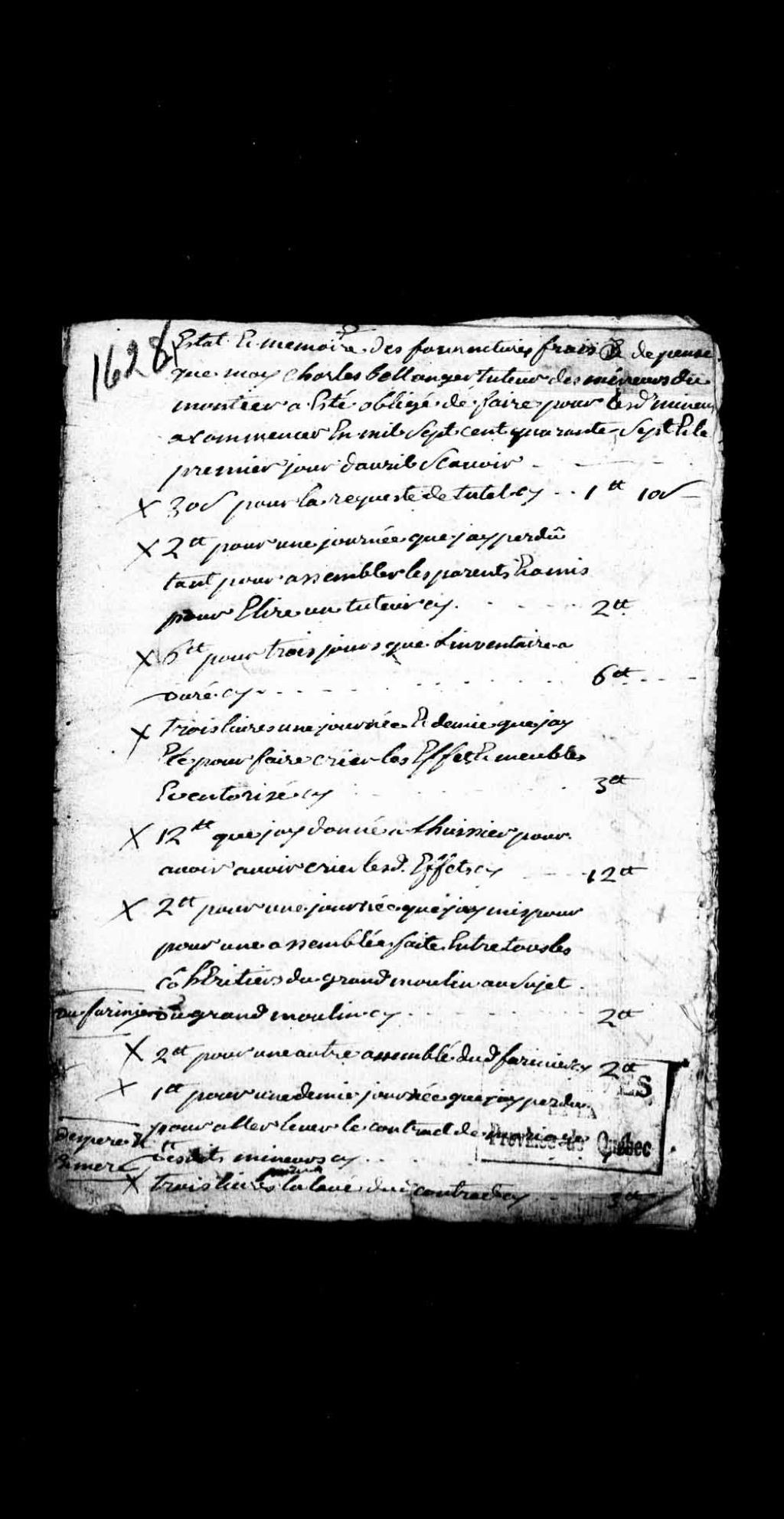 - Ce dossier en matières civiles provient de la Juridiction seigneuriale de la Rivière-du-Sud et de la Prévôté de Québec. Il comprend un état et mémoire des fournitures et frais de dépense fait par Charles Bélanger, tuteur des mineurs Dumontier; l'inventaire des biens de la succession du feu Alexis Dion Dumontier et de feue Marie-Simone Couillard, sa première femme, Marie-Barnabé Michon, sa seconde épouse et veuve; ainsi qu'une reconnaissance du compte de tutelle par Alexis Dumontier et Joseph Fournier, ladite reconnaissance est suivi du compte que rend le sieur Charles Bélanger, habitant de Saint-Thomas et tuteur des enfants mineurs du feu sieur Dumontier et de ladite défunte Couillard