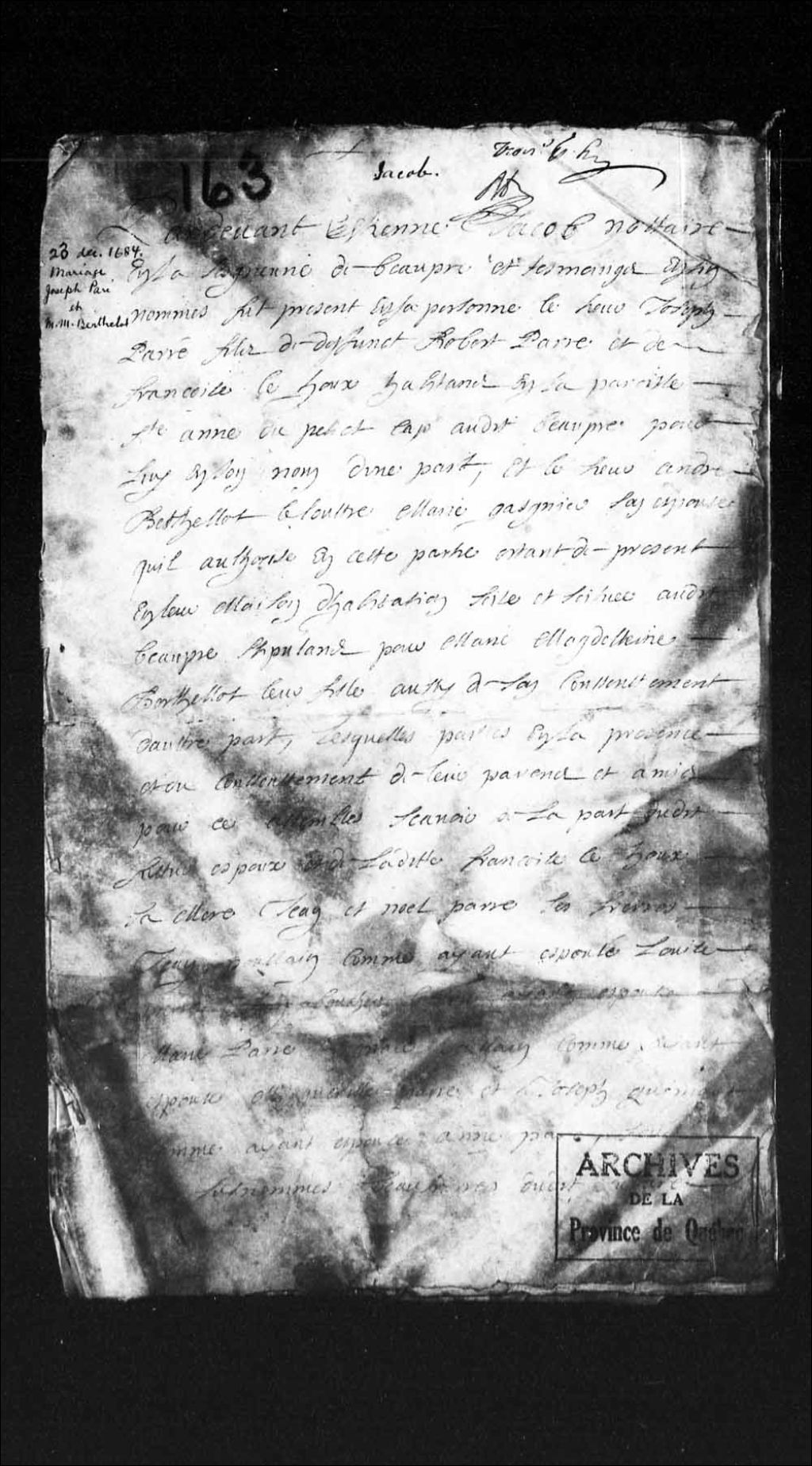 - Contrat de mariage de Joseph Paré, de Sainte-Anne-du-Petit-Cap (Sainte-Anne-de-Beaupré) fils de Robert Paré et de Françoise Lehoux, d'une part, et de Marie-Madeleine Berthelot, fille d'André Berthelot Le Loutre (LeLoutre) et Marie Gagné, d'autre part