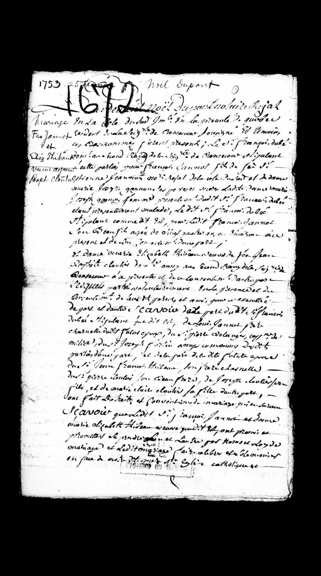 Mariage de François Jannot, fils de feu Étienne Janneau, notaire royal, et de Élise Thibault, veuve du feu Jean-Baptiste Cloutier, demeurant au second rang de la seigneurie de Bonsecours