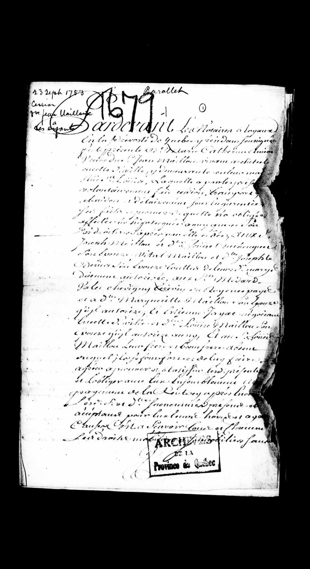 - Cession par Marie-Catherine Amiot, veuve de Jean Mailloux (Maillou), vivant architecte, à ses enfants