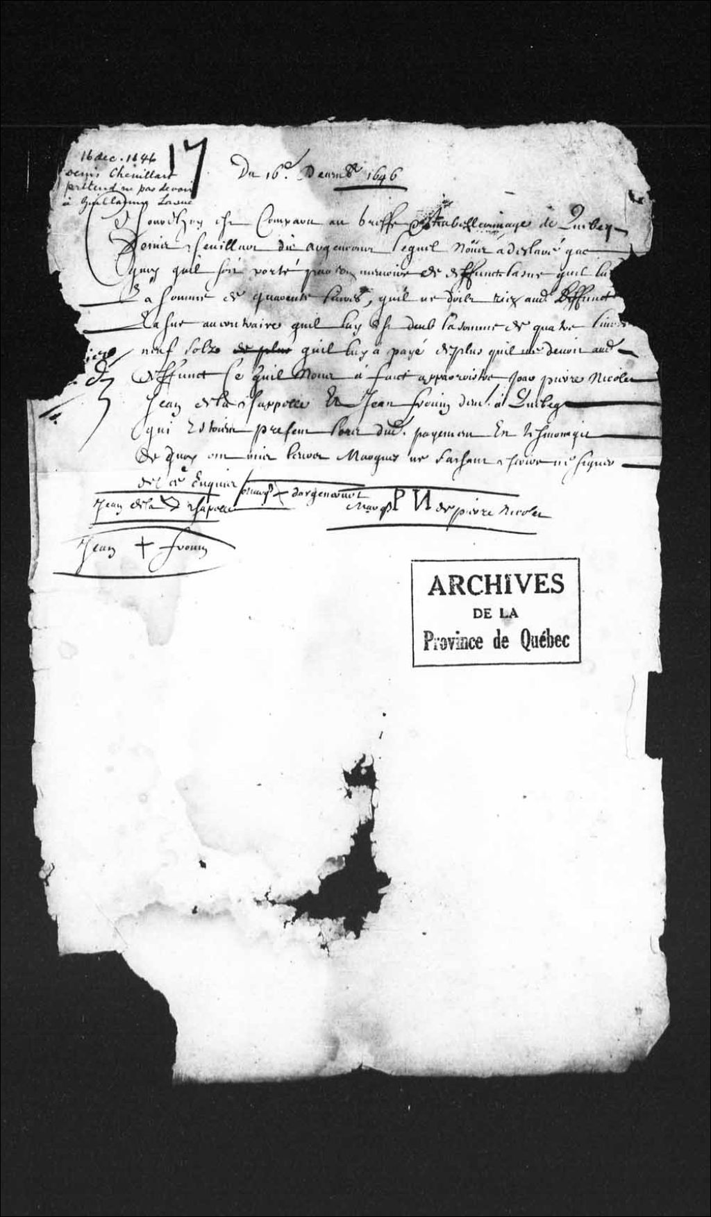 Déclaration de Denis Chenillart (Chemillart) dit Argencour (Dargencour) qui prétend prouver qu'il ne doit rien à défunt Lasue, matelot, en présence de Pierre Nicolet, Jean de La Chapelle (Lachapelle) et Jean Frouin de Québec