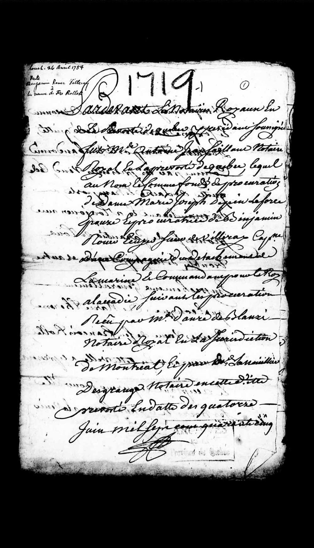 Vente par Benjamin Rouer de Villeray, capitaine d'une compagnie de la Marine, commandant pour le Roi en Acadie, marié à Marie-Josephte Pépin-Laforce, à la veuve de François Rollet, d'un terrain situé dans l'Anse-des-Mères, près de Québec, 26 avril 1754, Archives nationales à Québec, Collection Pièces judiciaires et notariales, (03Q,TL5,D1719).