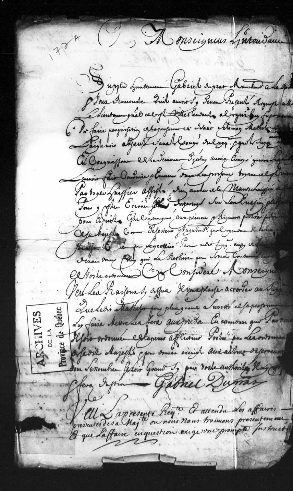 - Ce dossier en matières criminelles provient de la Prévôté de Québec et contient les interrogatoires ou les dépositions des personnes suivantes : Isaac Salomon, 26 ans, matelot, natif de Saint-Savinier en Saintonge, demeurant avant sa détention dans le navire «L Aigle Noire» où il est matelot; Denis Roberge, 54 ans, bourgeois de Québec. Il comprend des requêtes; l'interrogatoire; l'exploit d assignation; une ordonnance de Jacques de Meulles (Demeulles), seigneur de La Source, intendant; les conclusions du procureur du Roi