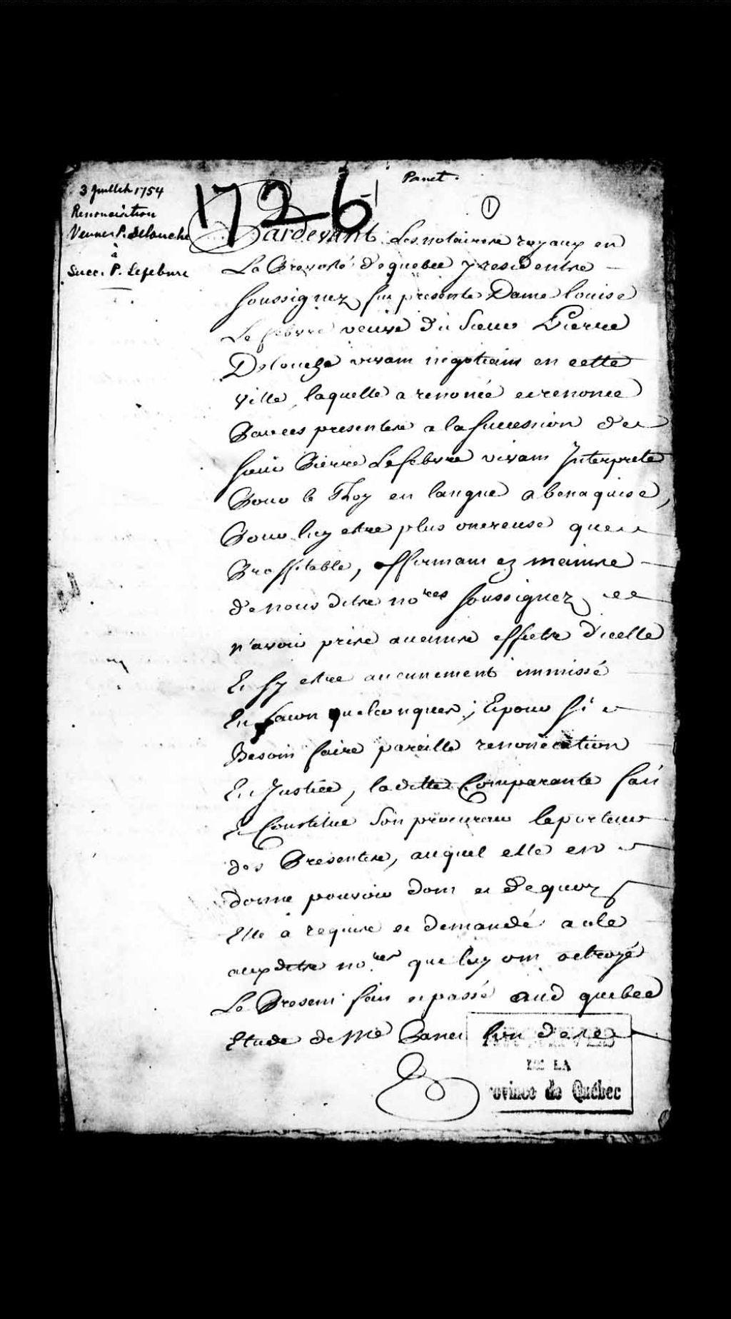 Renonciation par Louise Lefebvre (Lefèvre), veuve du sieur Pierre Delouche, vivant négociant de Québec, à la succession de feu Pierre Lefebvre, vivant interprète pour le Roi en langue abénaquise, 3 juillet 1754, Archives nationales à Québec, Collection Pièces judiciaires et notariales, (03Q,TL5,D1726).