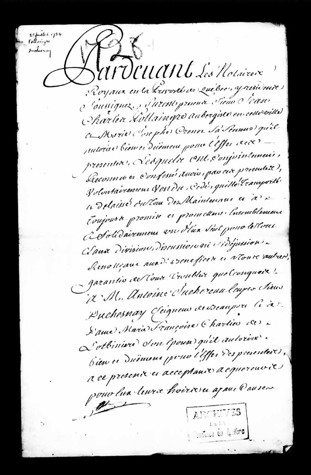 - Vente par le sieur Jean-Charles Pollaingre, aubergiste de Québec, à Antoine Juchereau Duchesnay, seigneur de Beauport, d'un emplacement de 39 pieds et demi de front sur 100 pieds de profondeur, situé rue Saint-Louis en la Haute-Ville de Québec