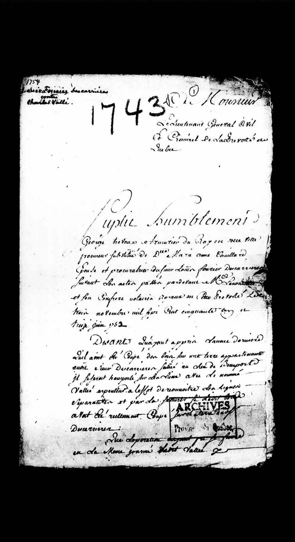 Procès de Louis Fourier des Carrières, écrivain employé dans les Bureaux de l'intendant de Québec, contre Charles Vallée