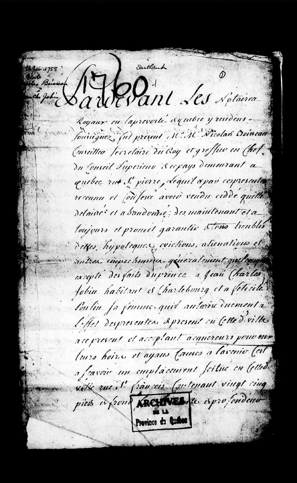 - Vente par Nicolas Boisseau, conseiller, secrétaire du Roi et greffier en chef du Conseil supérieur de Québec, à Jean-Charles Jobin, habitant de Charlesbourg, et à Félicité Poulin, sa femme, d'un emplacement situé à Québec, rue Saint-François, de 25 pieds de front sur 60 de profondeur
