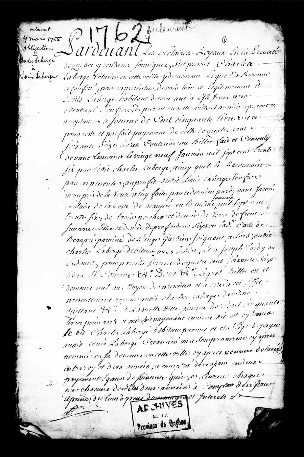 - Obligation de Charles Laberge, voiturier à Québec, à Louis Laberge, habitant demeurant à l'île Jésus