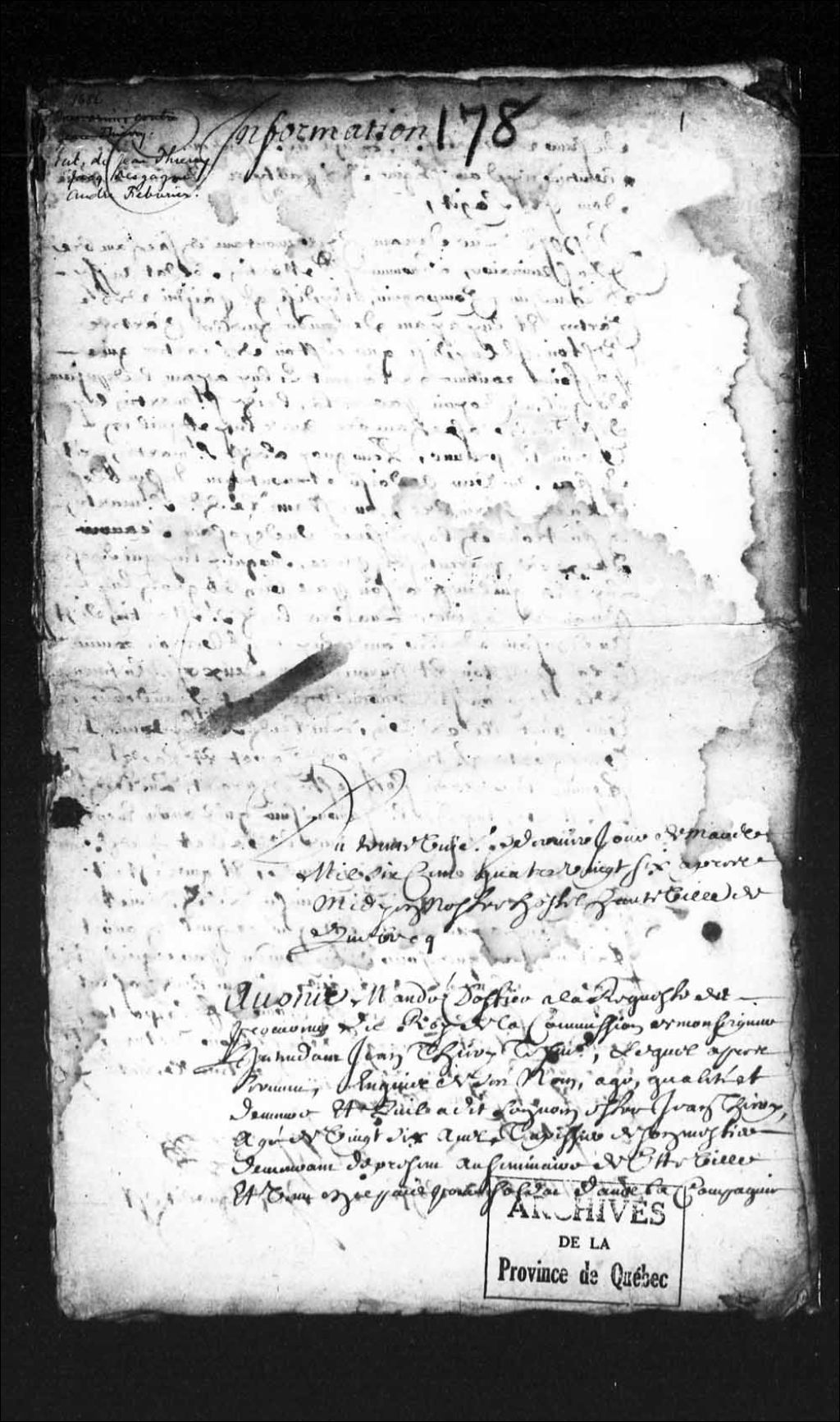 - Ce dossier en matières criminelles provient du Conseil souverain de Québec et contient les interrogatoires ou les dépositions des personnes suivantes : Jean Thierry, 26 ans, tapissier de son métier et venu en ce pays pour soldat de la compagnie de Des Méloizes, demeurant au Séminaire de Québec; Jacques Desgagnés, 23 ans, soldat de la compagnie de Des Méloizes, valet de Des Méloizes, demeurant à l'île Saint-laurent et de présent logé chez Etienne Landron (Landeron), rue Notre-Dame; André Febvrier (Février), 18 ans, domestique du Séminaire de Québec, demeurant ordinairement au Saut-à-la-Puce. Ce dossier comprend les interrogatoires des accusés et les conclusions du procureur du RoiLe titre complet de la pièce se lit comme suit : Procédures criminelles contre Jean Thierry, 26 ans, tapissier de son métier et venu en ce pays pour soldat de la compagnie de Des Méloizes, demeurant au Séminaire de Québec; Jacques Desgagnés, 23 ans, soldat de la compagnie de Des Méloizes, valet de Des Méloizes, demeurant à l'île Saint-laurent et de présent logé chez Etienne Landron (Landeron); André Février (Fébvrier), logé au Séminaire de Québec, demeurant ordinairement au Saut-à-la-Puce, tous trois accusés de complicité dans la fabrication des fausses cartes