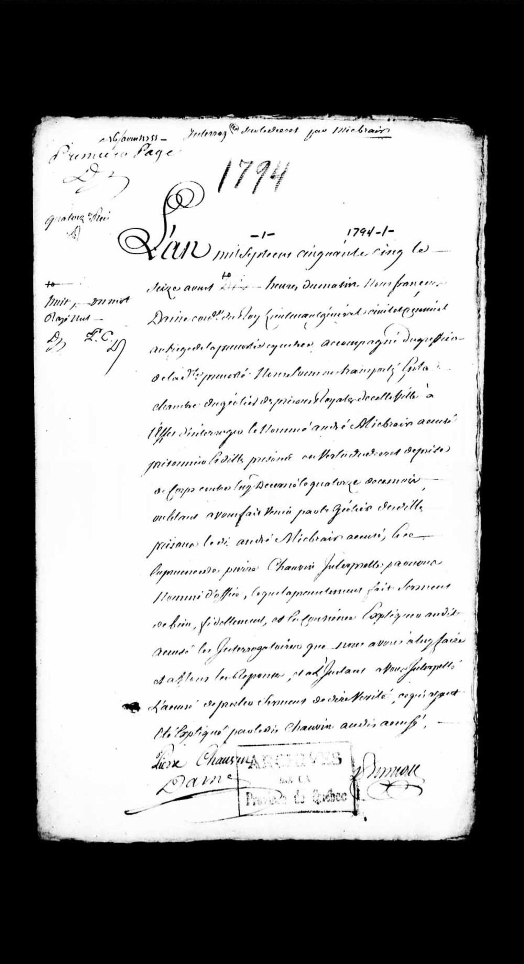 Procès criminel contre Charles Quemedy, 30 ans, évadé du bâtiment nommé «l'Actif», André Micbair (McBain), Journalier de 38 ans, logé en la Basse-Ville rue Sous-le-Fort, natif d'Irlande et Denis Quevillon (Quavillon), Irlandais de 19 ans, exécuteur de la haute justice, demeurant dans une maison près des remparts; pour vol, 16 avril 1755 - 10 septembre 1755, Archives nationales à Québec, Collection Pièces judiciaires et notariales, (03Q,TL5,D1794).