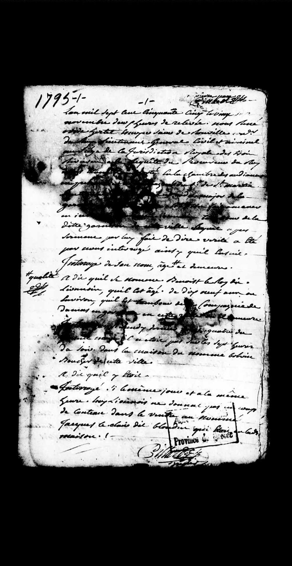 - Information contre Benoît LeRoy dit Lyonnais, tambour de la compagnie de Dumas, environ 19 ans, accusé d'avoir frappé à coups de couteau le nommé Blondin