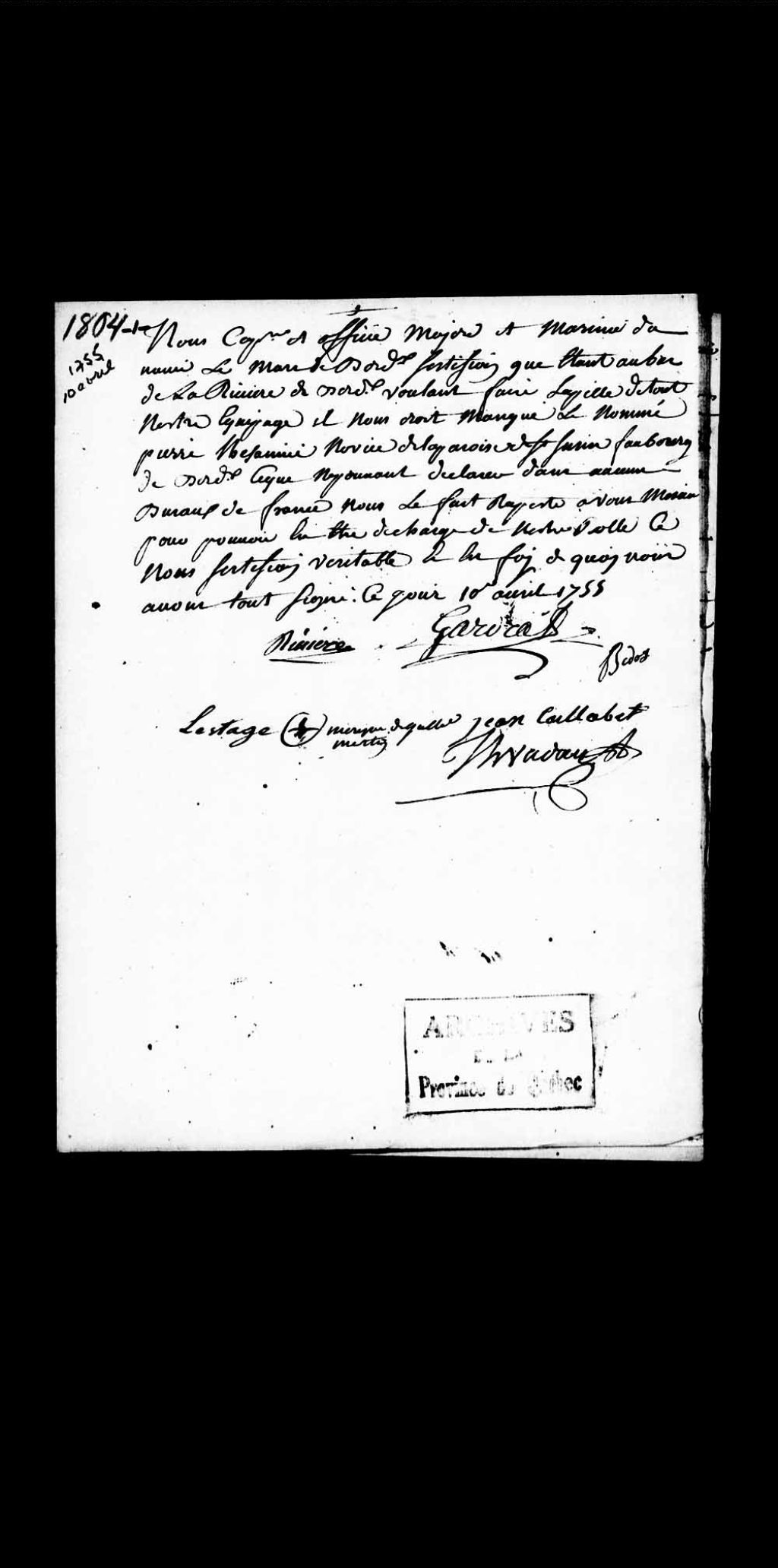 - Ce dossier provient de l'Amirauté de Québec. Il comprend une certification de déclaration véritable; un procès-verbal de mauvais temps; ainsi qu'une requête adressée au lieutenant général civil et criminel de l'Amirauté de Québec par Noël afin de faire assigner les principaux officiers de son équipage