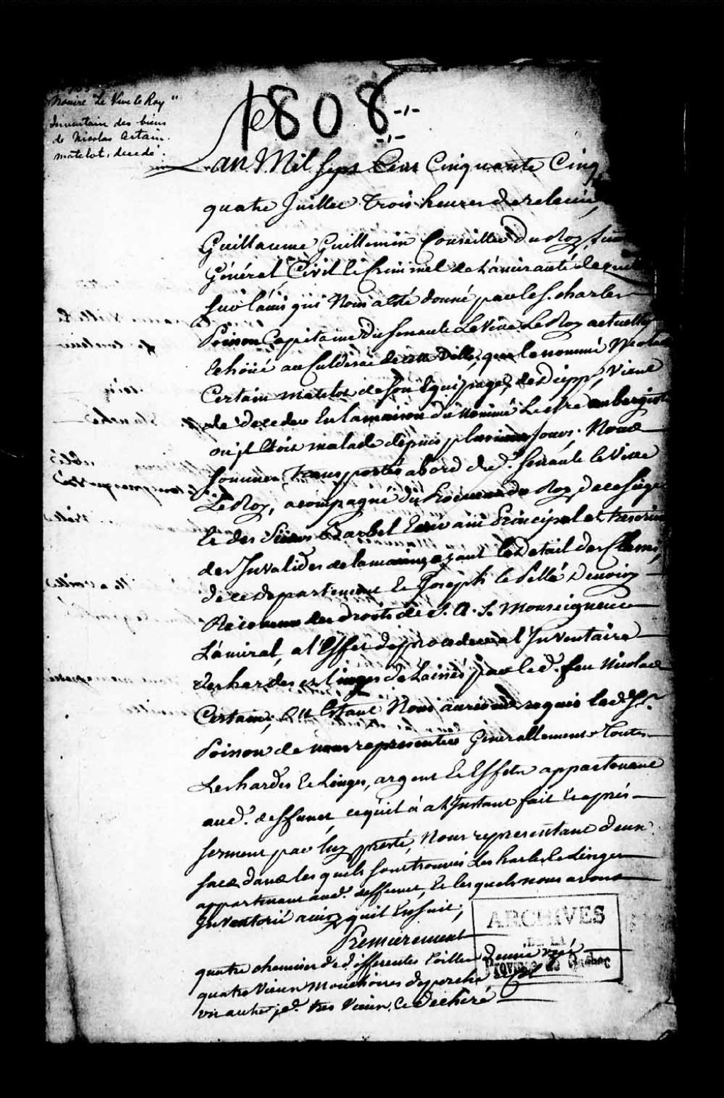Inventaire des biens du matelot Nicolas Certain, de Dieppe, matelot du senau «le Vive le Roi», décédé de maladie chez Leclerc, aubergiste, 4 juillet 1755, Archives nationales à Québec, Collection Pièces judiciaires et notariales, (03Q,TL5,D1808).