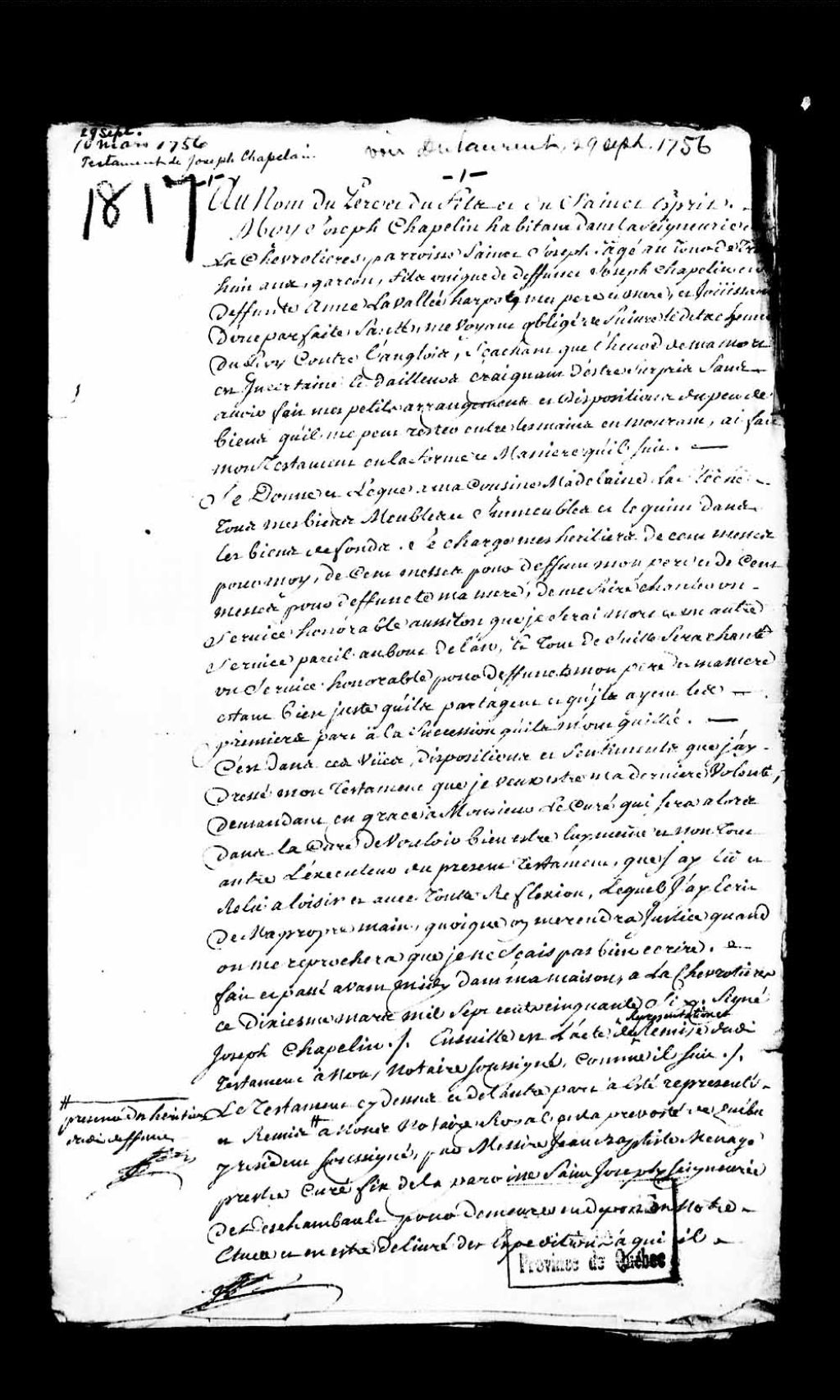 Testament de Joseph Chapelin (Chaplin), habitant de la seigneurie de la Chevrotière en la paroisse Saint-Joseph, 10 mars 1756, Archives nationales à Québec, Collection Pièces judiciaires et notariales, (03Q,TL5,D1817).
