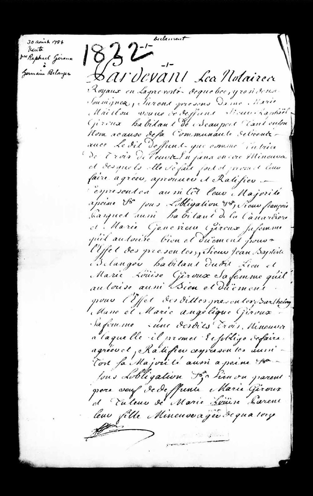 - Vente par Marie Mailloux (Maillou), veuve de Raphaël Giroux, habitant de Beauport, à Germain Bélanger, d'une terre située dans le village de la côte Saint-Michel de Beauport
