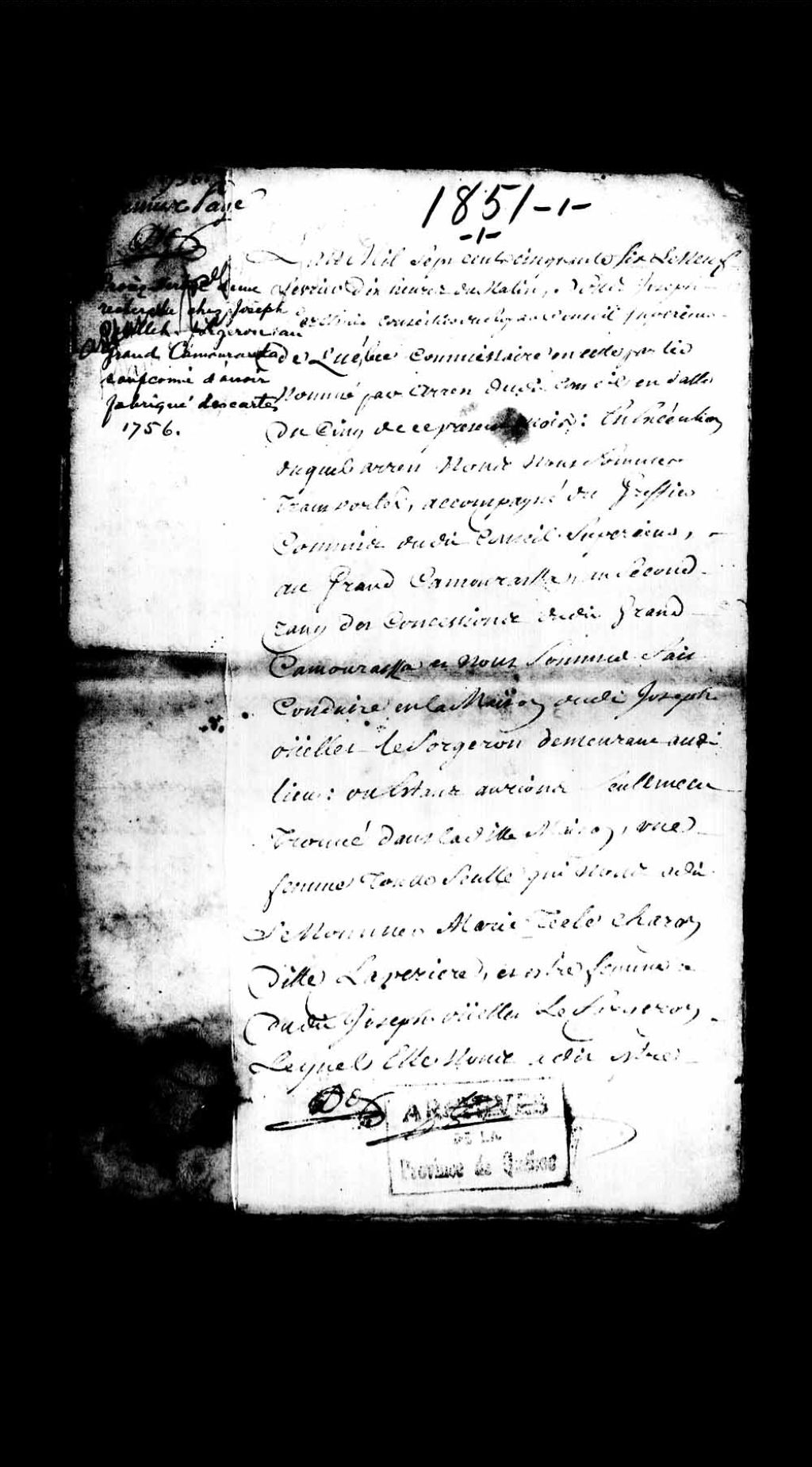 - Procès criminel par contumace contre Joseph Ouellet, forgeron de Kamouraska, comme complice du nommé René Lusignan, condamné à mort le 7 janvier 1756 pour distribution de fausses cartes