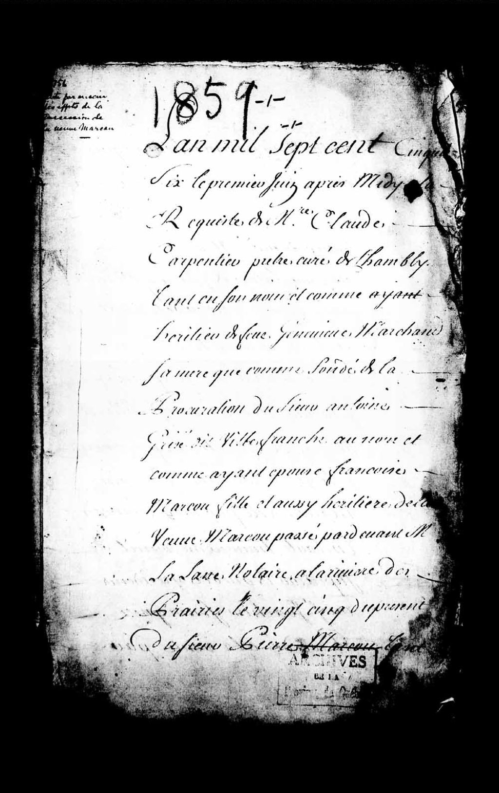 Vente à l'encan des effets de la succession de Geneviève Marchand, veuve Marcou (Marcoux)