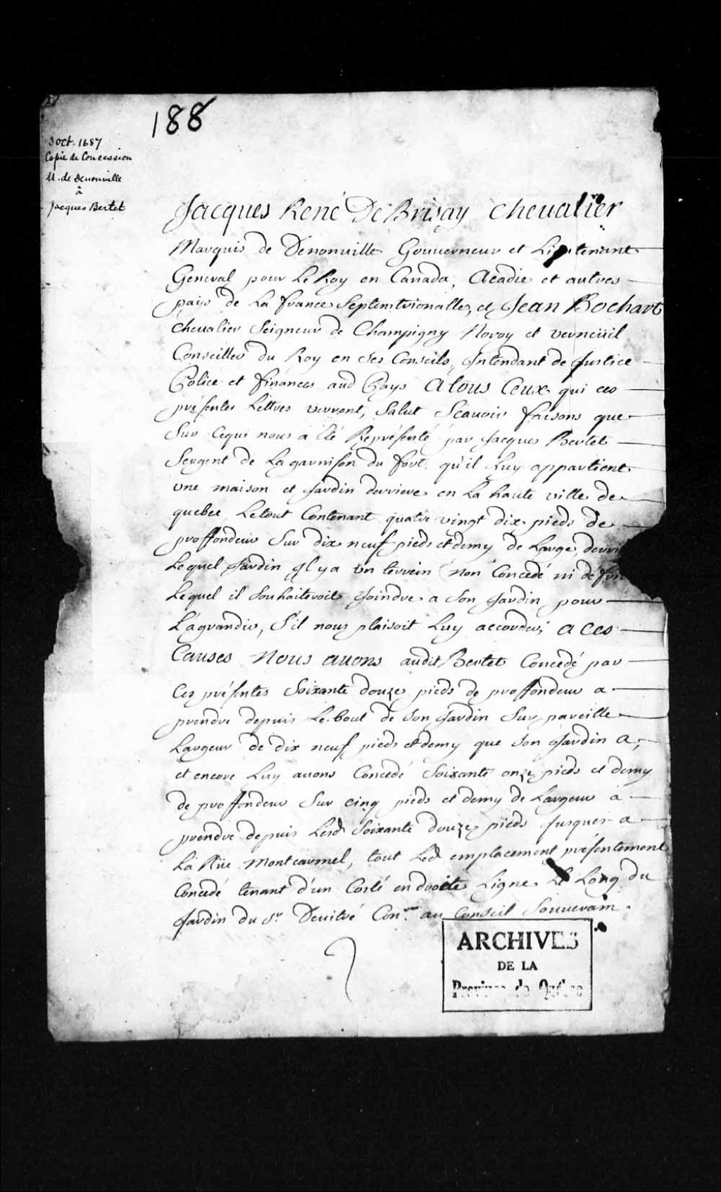 Concession par Jacques René de Brisay, Chevalier, Marquis de Denonville, gouverneur et Jean Bochart, chevalier, seigneur de Champigny, intendant à Jacques Bertet, sergent de la garnison du fort à Québec, d'un terrain (une maison et un jardin) en la Haute-Ville de Québec, 3 octobre 1687, Archives nationales à Québec, Collection Pièces judiciaires et notariales, (03Q,TL5,D188).