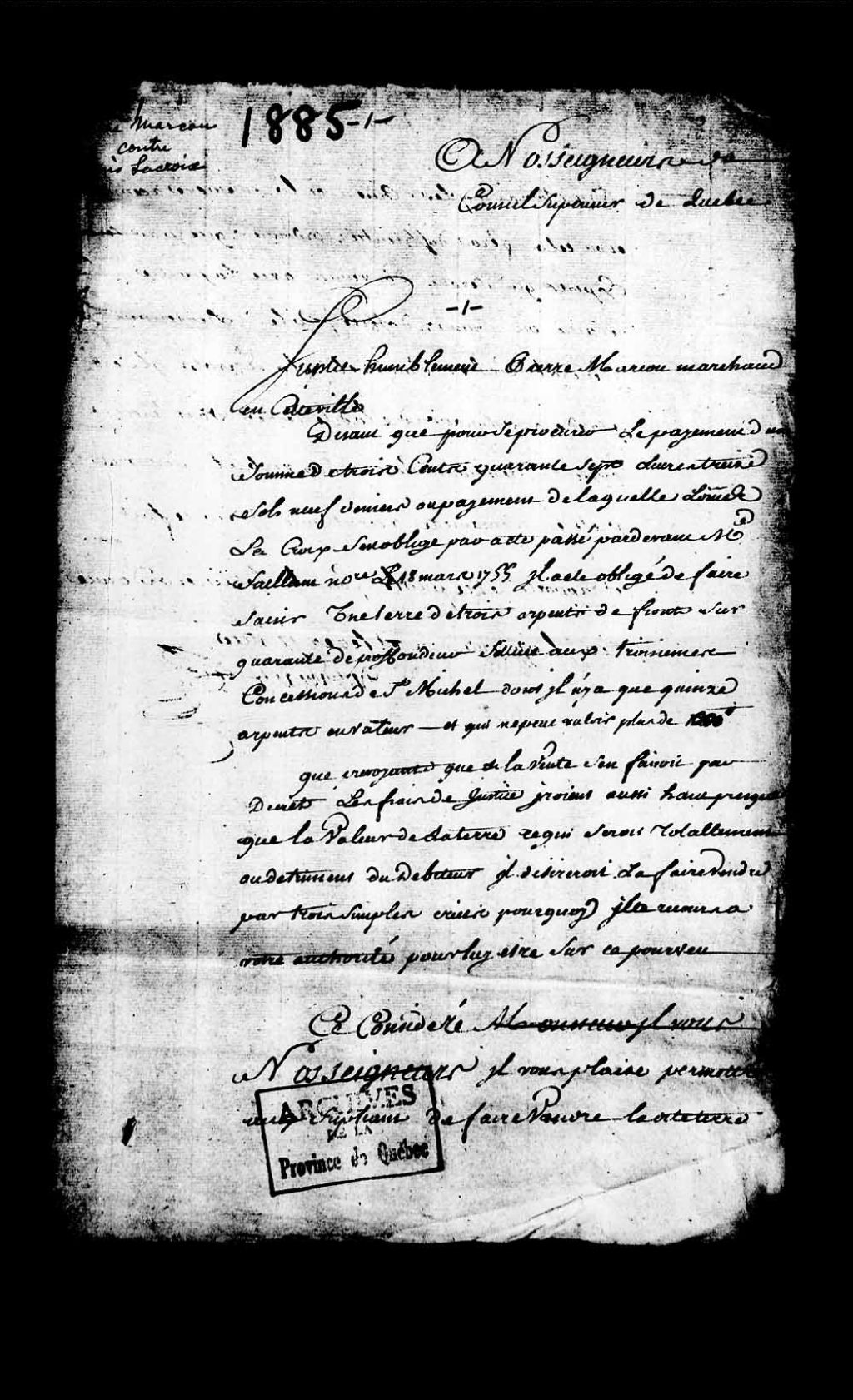 - Ce dossier provient du Conseil supérieur de Québec. Il comprend une requête adressée au Conseil supérieur de Québec par Pierre Marcoux afin de faire vendre une terre par trois criées; un acte d'obligation par Louis Lacroix au profit de Louis Marcoux (notaire Saillant); ainsi qu'un exploit d'assignation audit Lacroix