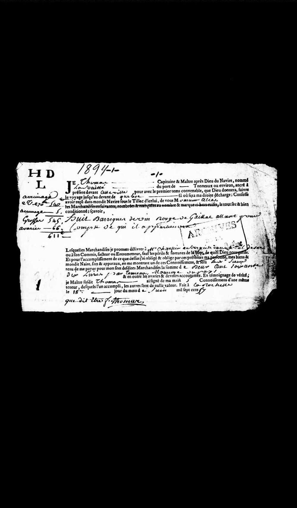 - Ce dossier en matières civiles provient de l'Amirauté de Québec. Il comprend un billet d'assurance au sieur Thomas pour un voyage de marchandises à bord du navire «la Société»; une requête adressée au lieutenant général civil et criminel de l'Amirauté de Québec par Étienne Jayat afin d'assigner le sieur Chartier; ainsi qu'un extrait des registres de l'Amirauté de Québec qui ordonne au demandeur de se justifier