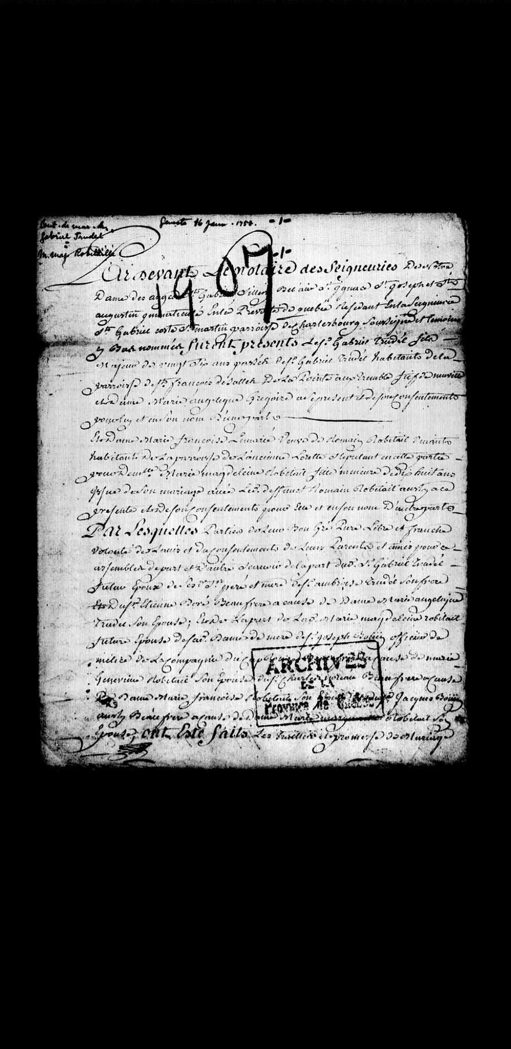 - Contrat de mariage de Gabriel Trudel, habitant de la Pointe-aux-Trembles, et de Marie-Madeleine Robitaille, fille de feu Romain Robitaille et de Marie-Françoise Lemarié, de l'Ancienne Lorette