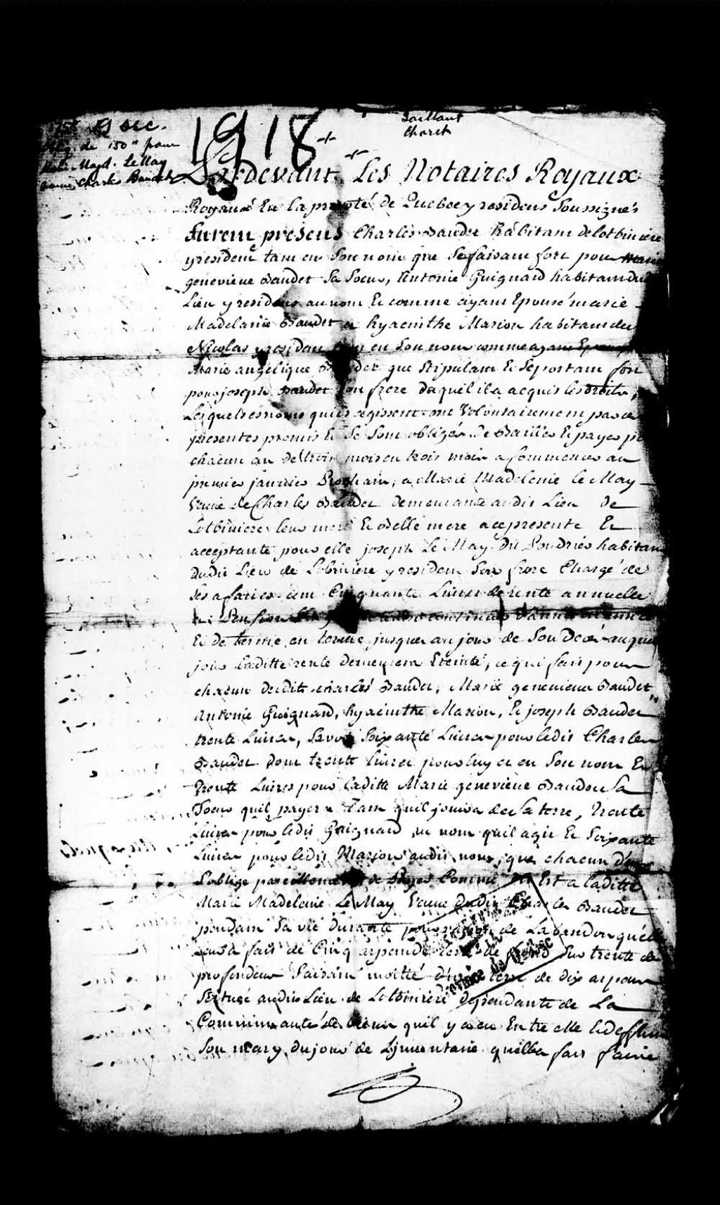 - Obligation de 150 livres de rente et pension viagère et abandon pour Marie-Madeleine Lemay, veuve du feu Charles Beaudet