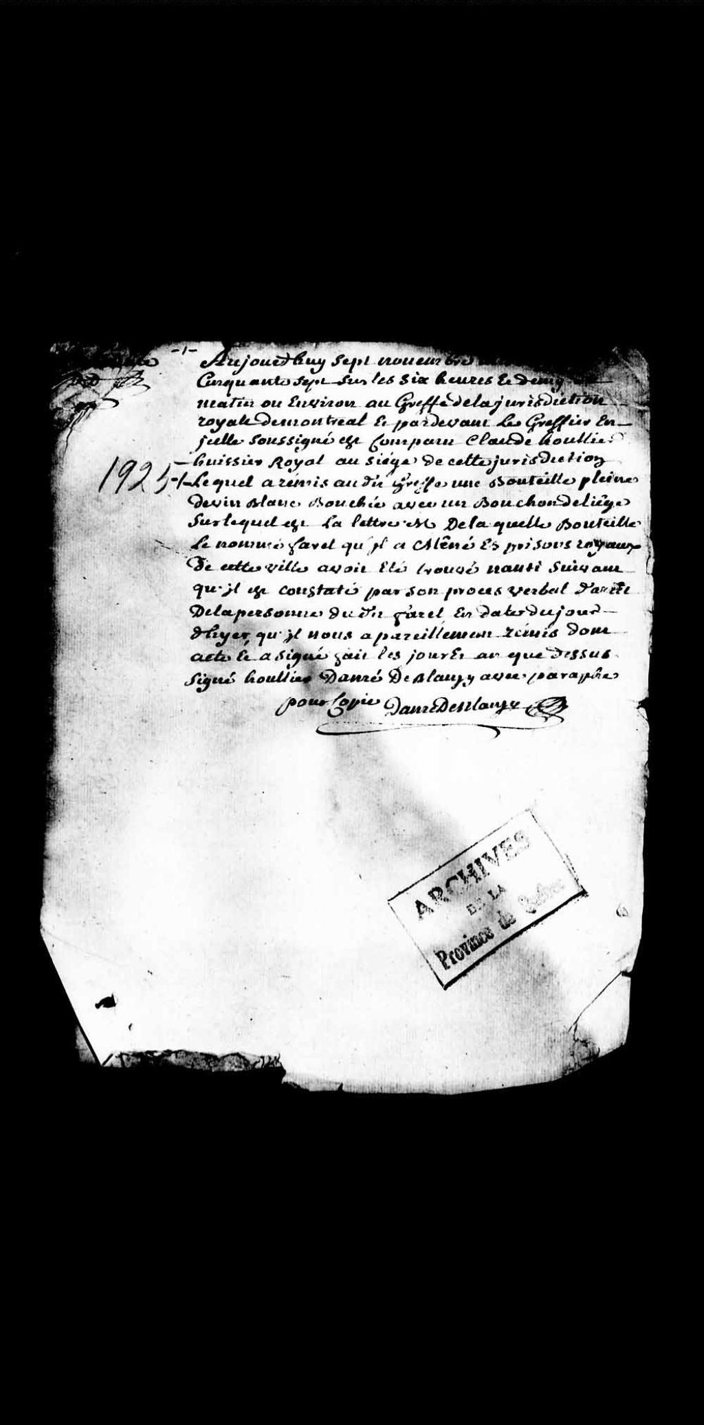 - Procès criminel contre André Malaguen, 22 ans, natif d'Irlande, journalier demeurant au faubourg Saint-Joseph en la maison du nommé Ripaille, Édouard Farel, 21 ans, natif du comté de Derey en Irlande, et autres pour vol chez le sieur Viger, à Montréal, Louis Daveluy, interprète en langue anglaise